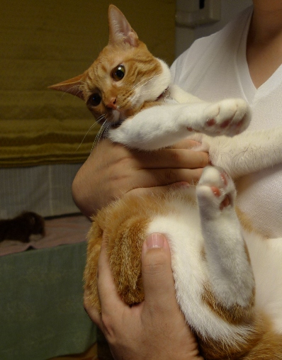 いさきちゃん、小顔なのと前から見ると肩幅狭いから細く見えるけど、実は長くてお腹もしっかり詰まっています(笑。 1歳で避妊手術したときは3キロジャストだったから、まめちゃんくらいだったんですけどね^^;