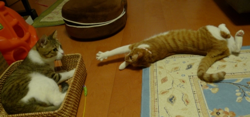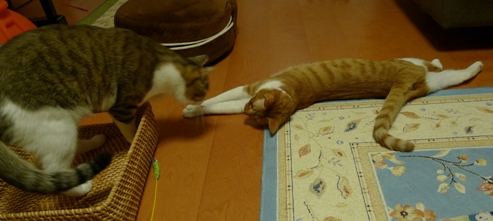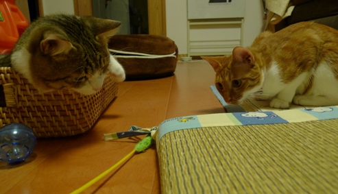 しゃこちゃん、いさきちゃんの間にいさきちゃんが羽根を取っちゃったねこじゃらしがあったので、