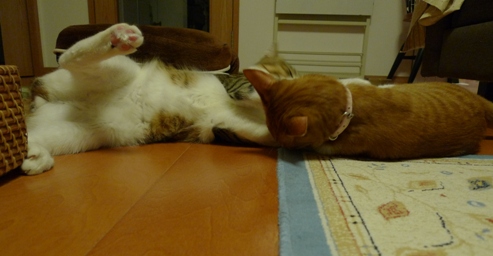 仕留めたので、毛づくろいに戻ろうとしたしゃこちゃんに、いさきちゃんがころーん