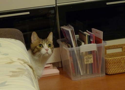 2にゃんで食事の後、普段早く食べ終わるしゃこちゃんが入っていることが多い籠に、