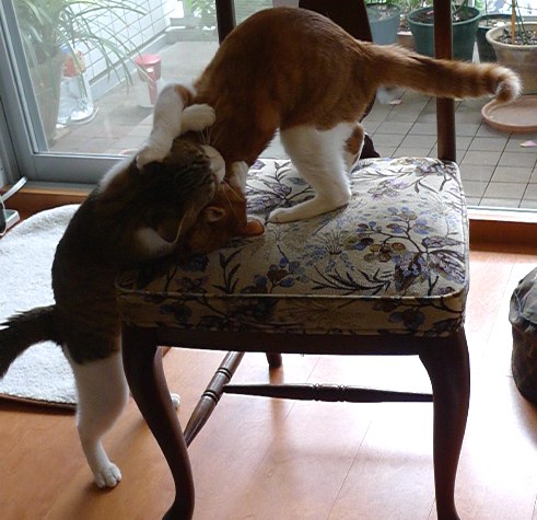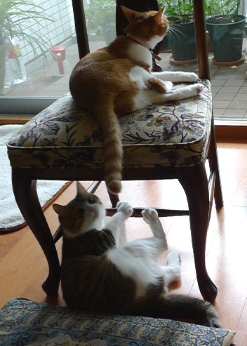いさきちゃんが椅子の上で、しゃこちゃんが下の棒にからまって(笑。