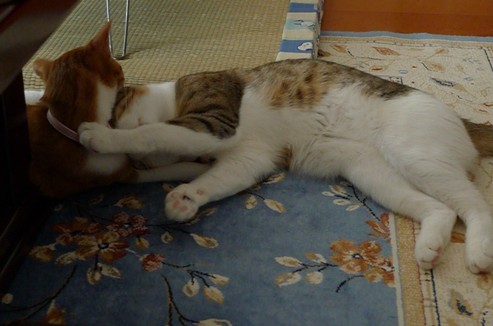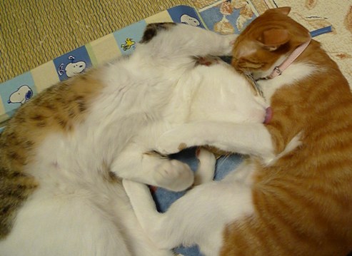 大きな甘えんぼさんを、いさきちゃんはかなり必死に舐め舐めしてます^^;