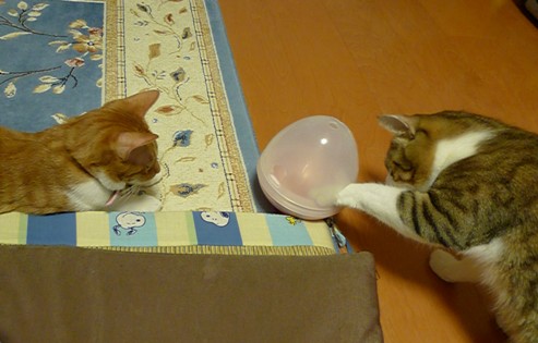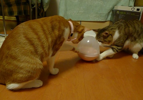 このピンクのものはすり鉢状になっていて中に入れたおやつを取ってね、というもの。